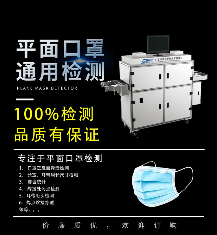 平面口罩檢測機,為檢測平面口罩的各種不良而定制,大致的檢測項目包括: