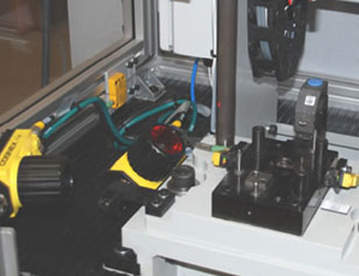 然后工件返回至機(jī)器的 1 號(hào)裝配臺(tái),在此利用視覺系統(tǒng)對(duì)代碼進(jìn)行驗(yàn)證,操作員則將密封墊、軸承和柱螺栓壓入下部的外殼內(nèi)。 位于第一個(gè)操作臺(tái)上的第二個(gè)尚菱視界 In-Sight 5110 視覺系統(tǒng)向上仰視,以此驗(yàn)證上部沖壓工具中的密封墊和夾具是否存在及其方向是否正確。