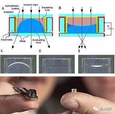 我們知道,鏡面的理想曲線是一條拋物線,不同曲率的拋物線其焦距不一樣。傳統(tǒng)的變焦鏡頭是通過調(diào)整兩個固定焦距的鏡頭之間的距離來實現(xiàn)變焦。而液態(tài)鏡頭目前隨著技術(shù)變化,也分好幾種。如:反射式液體鏡頭——旋轉(zhuǎn)水銀,得到一個理想的拋物面;自適應(yīng)性液態(tài)照相機鏡頭——由一對水滴組成,它們暴露于高頻聲波下往返振動,隨之改變透鏡的焦距;介電式液態(tài)鏡頭——使用液體聚焦光線,通過不同的電壓改變液體的形狀從而控制成像。有使用一種液體的,也有使用發(fā)射率不同的完全不能融合的兩種液體的。(還有的使用液態(tài)硅等等,就不一一列舉)