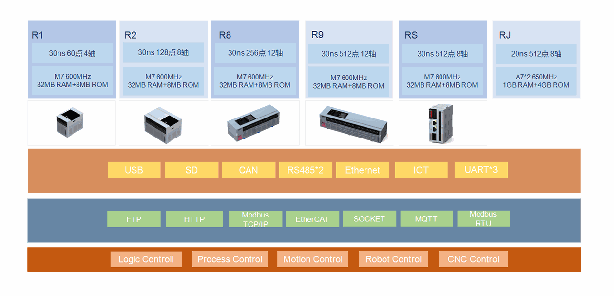 R系列中小型PLC,整體處理效率達到中小型PLC一流水準,并完善控制種類算法,通訊架構豐富,支持4、8、12軸多軸運控控制,可應用所有OEM應用領域 。