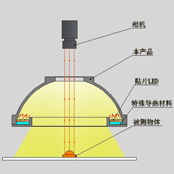 圓頂光源是一種高均勻性的光源,由高亮度貼片LED發(fā)出的光經(jīng)過球面漫反射后形成均勻的光線。適合檢測表面反光、起伏不平的物體。